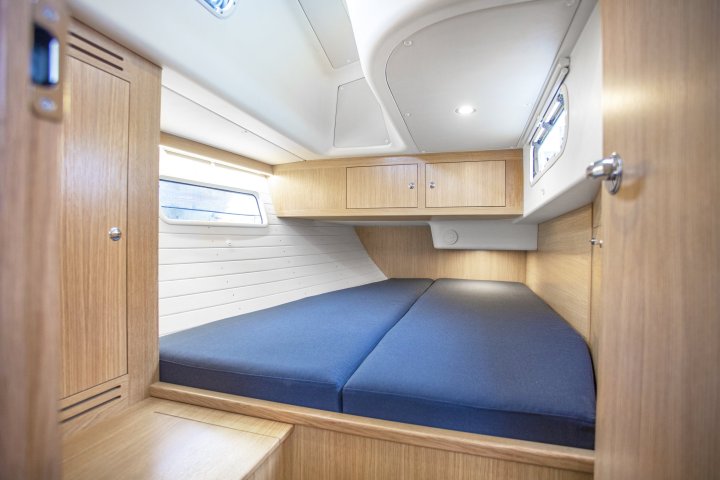The two-cabin layout features a larger owner’s cabin in the bow, with a wider and longer berth (210 cm in length). The owner’s cabin also includes more cupboards and drawers, and features a recessed sliding door. The front bulkhead has been slightly moved aft, increasing the size of the bow’s sail storage locker. The bathroom (word choice intended) is more spacious and offers greater storage than the standard version. It also includes a separate shower with a glass door, creating a feeling of a true bathroom. Instead of the starboard aft berth, there is a large storage compartment accessible from the cockpit, completed with a separate wet gear compartment which is accessible from the bathroom.